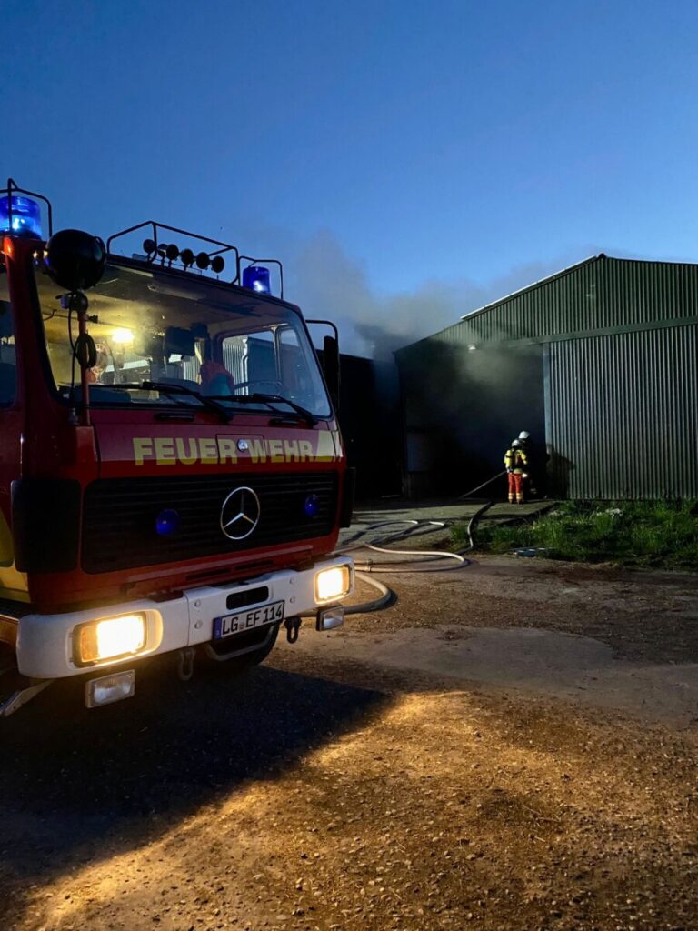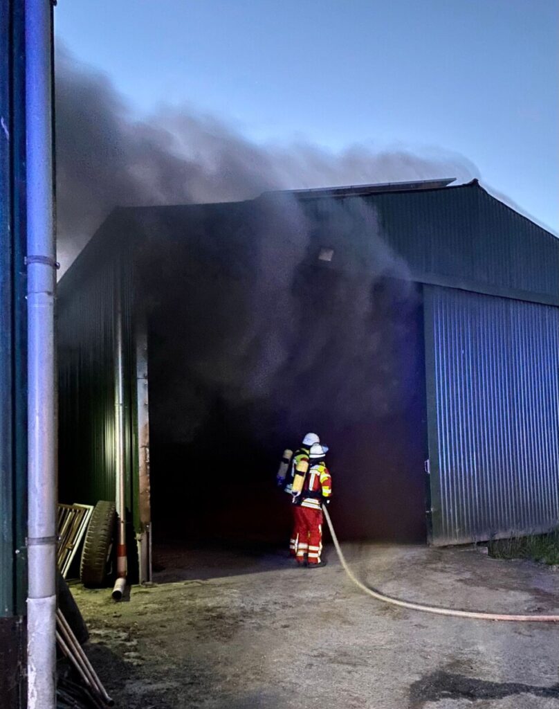 Nach Eintreffen an der Einsatzstelle fanden die Einsatzkräfte eine stark qualmende Stahlhalle vor, in der ein Hoflader in Vollbrand stand. Durch das schnelle Eingreifen der Feuerwehr konnte ein Übergreifen auf die in der Halle gelagerten Heu Bunde und Landmaschinen verhindert werden.