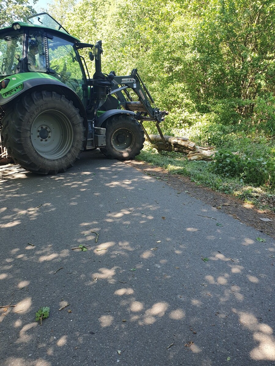 Mit einem Traktor wurde der Baum von der Straße geschoben. Im Anschluss wurden noch Äste beseitigt und die Straße gereinigt.